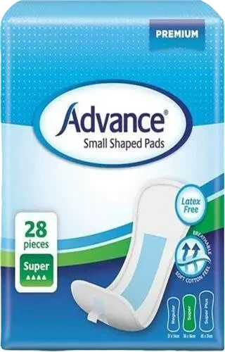 Advance® Small Shaped Pads - Product Code: 82020 Super ▲▲▲▲ Packet 28 pieces Carton Qty: 8 packs/224 pieces Absorbency: Regular (28 pieces) Super (28 pieces) Super Plus (28 pieces) Product Enquiry Product Enquiry Account Application Account Application Advance® Absorbency Scale Advance® Small Shaped Pads offer great protection in a discreet pad. They are designed for users with light to moderate incontinence. Advance® Small Shaped Pads are discreet, breathable and anatomically designed for ultimate comfort and confidence. This product is often the first used incontinence aid in the Advance® range for those with bladder weakness or stress incontinence. It is designed to be worn with close fitting conventional briefs or Advance® Fixation Pants and has an adhesive back strip to ensure a secure fit. Pad Size Dimensions: 36 cm x 16 cm. Packet quantity: 28 pieces Carton quantity: 8 packs/224 pieces Key Features Additional acquisition layer for fast absorption Cloth-like outer cover is soft and discreet Adhesive strip for secure fixation Soft side shields help to prevent side leakage Anatomic shape allows close and comfortable fit Breathable cloth-like materials for comfort & discretion Instructions Unfold the pad and fold it lengthways to form a gully. Remove the paper from the adhesive strip Place the pad inside the underwear ensuring that the adhesive strip is securely attached to the underwear Pull up the underwear and adjust if needed