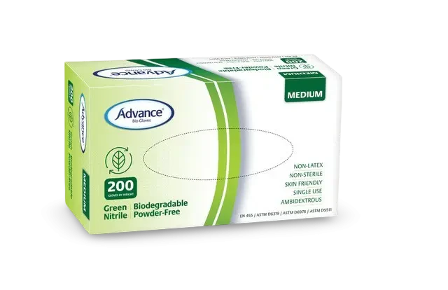 Advance® Biodegradable Green Nitrile Powder Free Gloves | Extra Small - Product Code: GB210 Packet 200 pieces Carton Qty: 10packs/2000 gloves Size: Extra Small (200 pieces) Small (200 pieces) Medium (200 pieces) Large (200 pieces) Extra Large (200 pieces) Extra Large (100 pieces) Product Enquiry Product Enquiry Account Application Account Application The versatility and performance is uncompromised when compared to an equivalent non-biodegradable nitrile glove. Functional Benefits: Provides an "end of life solution" to reduce accumulation of waste in landfills. Able to biodegrade in anaerobic environments. Specially designed to biodegrade in landfill through microbial activity. Free from latex protein, eliminating Type I immediate hypersensitivity reaction. Designed with accelerator free formulation to minimise risk of Type IV Delayed Hypersensitivity reaction. Quality Standards: Conforms to EN455 Standards, ASTM D6319 and ASTM D6978-05 Manufactured under QSR (GMP) ISO 9001 and ISO 3485:2016 Quality Management System. Product: Green Nitrile Examination Glove, Powder Free, Non-sterile Design & Features: Ambidextrous, finger textured, beaded cuff, proven biodegradable with ASTM D5511 testing Chemotherapy and Fentanyl tested Colour: Green Sizes available: X-Small, Small, Medium, Large, X-Large, XX-Large Pack Quantity: 200 gloves Carton Quantity: 10packs/2000 gloves Packet quantity: 200 pieces Carton quantity: 10packs/2000 gloves Key Features Sizes X-Small to XX-Large available. Provides an "end of life solution" to reduce accumulation of waste in landfills. Able to biodegrade in anaerobic environments. Specially designed to biodegrade in landfill through microbial activity. Free from latex protein, eliminating Type I immediate hypersensitivity reaction. Designed with accelerator free formulation to minimise risk of Type IV Delayed Hypersensitivity reaction. Conforms to ASTM D6319-10 and EN455 Standards Manufactured under QSR (GMP) ISO 9001:2015 and ISO 13485:2016 Quality Management System. Non Latex Non Sterile Textured Fingertips Powder Free Single Use Ambidextrous Bead Cuff Skin Friendly