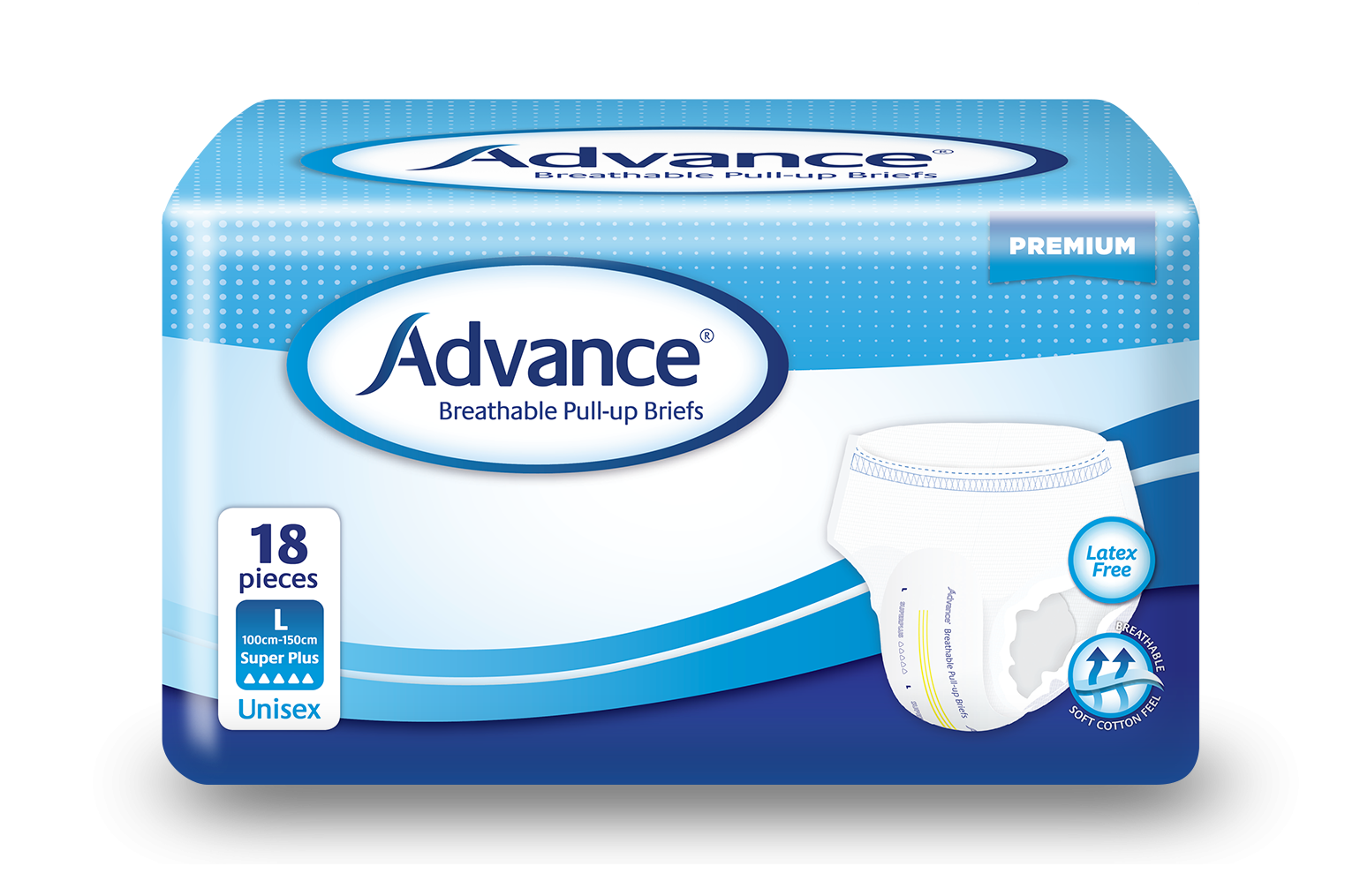 Advance® Breathable Pull-up Briefs - Product Code: 12030 Large 100cm - 150cm Super Plus ▲▲▲▲▲ Packet 18 pieces Carton Qty: 4 packs/72 pieces Size & Absorbency: S 55cm - 90cm / Super Plus (18 pieces) M 80cm - 120cm / Regular (18 pieces) M 80cm - 120cm / Super (18 pieces) M 80cm - 120cm / Super Plus (18 pieces) L 100cm - 150cm / Regular (18 pieces) L 100cm - 150cm / Super (18 pieces) L 100cm - 150cm / Super Plus (18 pieces) XL 130cm-170cm / Super (18 pieces) XL 130cm - 170cm / Super Plus (18 pieces) 2XL 150cm - 200cm / Super Plus (12 pieces) 3XL 190cm - 242cm (10 pieces) Product Enquiry Product Enquiry Account Application Account Application Advance® Absorbency Scale Advance® Breathable Pull-up Briefs are for users with light to moderate incontinence. They are easy to use, fully elasticated and anatomically designed for a comfortable fit, very similar to conventional briefs. Ideal for users with active lifestyles as they prolong independence and can be worn with confidence even for those who may experience occasional bowel incontinence. Packet quantity: 18 pieces Carton quantity: 4 packs/72 pieces Key Features Fully elasticated and anatomically shaped briefs 3D funnel acquisition layer for fast and even absorption Double anti-leak cuffs for extra security and leakage protection Breathable cloth-like materials ensure comfort and discretion Easy to read wetness indicator changes colour as a reminder for replacement Instructions Pull up like regular underwear, the front has blue elastic at the waist To remove, tear the side seams or pull down Roll the brief and dispose responsibly