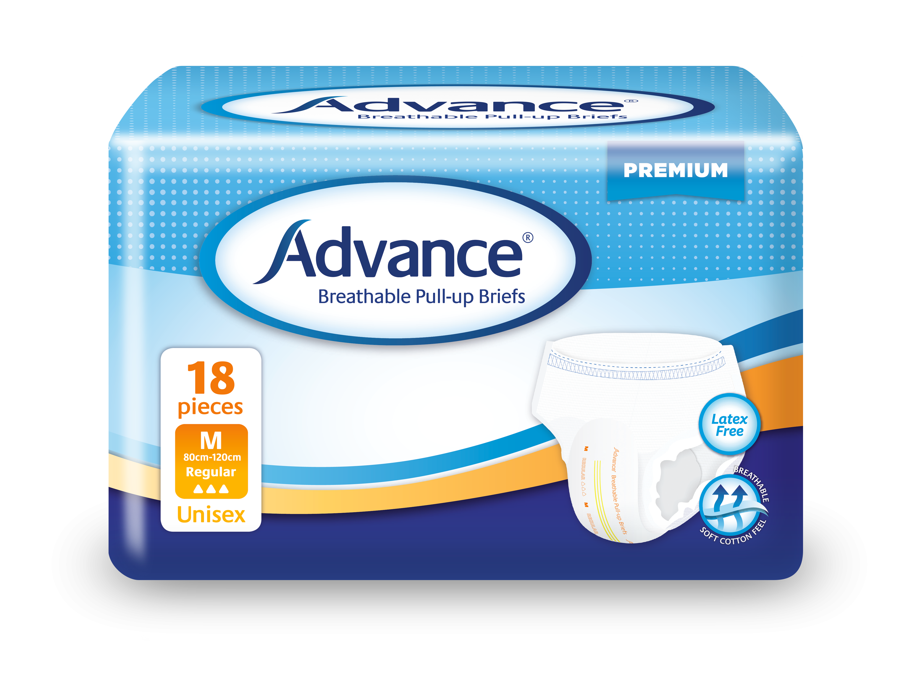 Advance® Breathable Pull-up Briefs - Product Code: 10120 Medium 80cm - 120cm Regular ▲▲▲ Packet 18 pieces Carton Qty: 4 packs/72 pieces Size & Absorbency: S 55cm - 90cm / Super Plus (18 pieces) M 80cm - 120cm / Regular (18 pieces) M 80cm - 120cm / Super (18 pieces) M 80cm - 120cm / Super Plus (18 pieces) L 100cm - 150cm / Regular (18 pieces) L 100cm - 150cm / Super (18 pieces) L 100cm - 150cm / Super Plus (18 pieces) XL 130cm-170cm / Super (18 pieces) XL 130cm - 170cm / Super Plus (18 pieces) 2XL 150cm - 200cm / Super Plus (12 pieces) 3XL 190cm - 242cm (10 pieces) Product Enquiry Product Enquiry Account Application Account Application Advance® Absorbency Scale Advance® Breathable Pull-up Briefs are for users with light to moderate incontinence. They are easy to use, fully elasticated and anatomically designed for a comfortable fit, very similar to conventional briefs. Ideal for users with active lifestyles as they prolong independence and can be worn with confidence even for those who may experience occasional bowel incontinence. Packet quantity: 18 pieces Carton quantity: 4 packs/72 pieces Key Features Fully elasticated and anatomically shaped briefs 3D funnel acquisition layer for fast and even absorption Double anti-leak cuffs for extra security and leakage protection Breathable cloth-like materials ensure comfort and discretion Easy to read wetness indicator changes colour as a reminder for replacement Instructions Pull up like regular underwear, the front has blue elastic at the waist To remove, tear the side seams or pull down Roll the brief and dispose responsibly