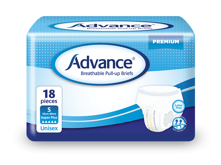 Advance® - Product Code: 12011 Packet 17 pieces Carton Qty: 4 packs/68 pieces Size & Absorbency: XXXS 35-60cm / Super Plus (17 pieces) XXS 40-65cm / Super Plus (13 pieces) XS 40-70cm / Super Plus (18 pieces) S 55cm - 90cm / Super Plus (18 pieces) M 80cm - 120cm / Regular (18 pieces) M 80cm - 120cm / Super (18 pieces) M 80cm - 120cm / Super Plus (18 pieces) L 100cm - 150cm / Regular (18 pieces) L 100cm - 150cm / Super (18 pieces) L 100cm - 150cm / Super Plus (18 pieces) XL 130cm-170cm / Super (18 pieces) XL 130cm - 170cm / Super Plus (18 pieces) 2XL 150cm - 200cm / Super Plus (12 pieces) 3XL 190cm - 240cm / Super Plus (10 pieces) 3XL 190cm - 242cm (10 pieces) Product Enquiry Product Enquiry Account Application Account Application Advance® Absorbency Scale Advance® Breathable Pull-up Briefs are for users with light to moderate incontinence. They are easy to use, fully elasticated and anatomically designed for a comfortable fit, very similar to conventional briefs. Ideal for users with active lifestyles as they prolong independence and can be worn with confidence even for those who may experience occasional bowel incontinence. Packet quantity: 17 pieces Carton quantity: 4 packs/68 pieces Key Features Fully elasticated and anatomically shaped briefs 3D funnel acquisition layer for fast and even absorption Double anti-leak cuffs for extra security and leakage protection Breathable cloth-like materials ensure comfort and discretion Instructions Pull up like regular underwear, the front has blue elastic at the waist To remove, tear the side seams or pull down Roll the brief and dispose responsibly