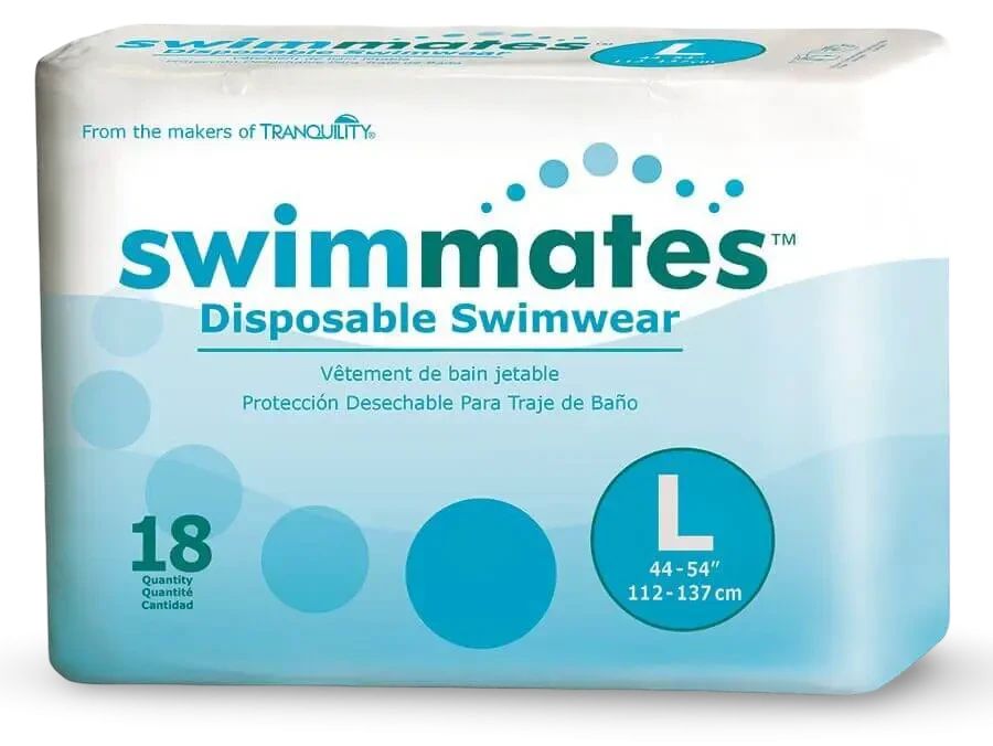 Swimmates Disposable Swimwear - Product Code: 2846 Large 112cm - 137cm Packet 18 pieces Carton Qty: 4 packs / 72 pieces Size: Small 56cm - 91cm (22 pieces) Medium 86cm - 122cm (20 pieces) Large 112cm - 137cm (18 pieces) X-Large 122cm -168cm (14 pieces) XX-Large 157cm -203cm (12 pieces) Product Enquiry Product Enquiry Account Application Account Application SPQ Limited is the sole appointed New Zealand & Australian distributor of Swimmates™ products. For all retail and wholesale enquiries please contact the SPQ team on customerservice@spq.co.nz or phone +64 6 879 6328 Swimmates® Disposable Adult & Youth Swim Diapers are designed to be worn under a bathing suit to provide containment for bowel incontinence. Ideal for aqua therapy or any day in the pool. Providing dignity, confidence and discretion. Feel confident and secure, enjoy the water and experience the advantages of buoyant exercise without the worry of embarrassment. Designed to have minimal swelling and does not break apart. Blue moisture-proof barrier and Kufguards® (inner leg cuffs) help contain bowel incontinence, keeping the pool and bathing suit clean. Wide range of sizes to fit most youth, teen and adult swimmers. Latex-free. Packet quantity: 18 pieces Carton quantity: 4 packs / 72 pieces Key Features Highly Comfortable Form-Fitting & Discreet to make it easier to hide under swim suit. Easy to Remove with tear away side seam Blue rear waist elastic on an ample, full rise waist panel for a better fit that is easy to pull up and down Designed to discreetly secure bowel incontinence Instructions ** Swimmates discreet disposable bowel containment swimwear is designed for one time use under swimwear then easily torn away and disposed of after swimming ** Pull up like regular underwear, the back/rear of the product has distinctive blue elastic on the waistline. To remove, use the tear away side seams for easy removal. Roll the brief and dispose responsibly.
