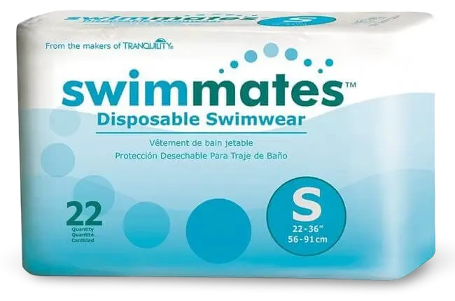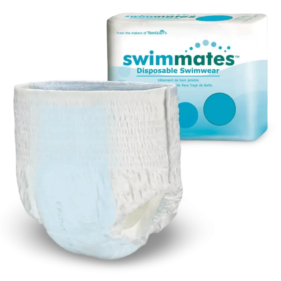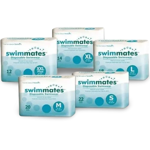 Swimmates Disposable Swimwear - Product Code: 2844 Small 56cm - 91cm Packet 22 pieces Carton Qty: 4 packs/88 pieces Size: Small 56cm - 91cm (22 pieces) Medium 86cm - 122cm (20 pieces) Large 112cm - 137cm (18 pieces) X-Large 122cm -168cm (14 pieces) XX-Large 157cm -203cm (12 pieces) Product Enquiry Product Enquiry Account Application Account Application SPQ Limited is the sole appointed New Zealand & Australian distributor of Swimmates™ products. For all retail and wholesale enquiries please contact the SPQ team on customerservice@spq.co.nz or phone +64 6 879 6328 Swimmates® Disposable Adult & Youth Swim Diapers are designed to be worn under a bathing suit to provide containment for bowel incontinence. Ideal for aqua therapy or any day in the pool. Providing dignity, confidence and discretion. Feel confident and secure, enjoy the water and experience the advantages of buoyant exercise without the worry of embarrassment. Designed to have minimal swelling and does not break apart. Blue moisture-proof barrier and Kufguards® (inner leg cuffs) help contain bowel incontinence, keeping the pool and bathing suit clean. Wide range of sizes to fit most youth, teen and adult swimmers. Latex-free. Packet quantity: 22 pieces Carton quantity: 4 packs/88 pieces Key Features Highly Comfortable Form-Fitting & Discreet to make it easier to hide under swim suit. Easy to Remove with tear away side seam Blue rear waist elastic on an ample, full rise waist panel for a better fit that is easy to pull up and down Designed to discreetly secure bowel incontinence Instructions ** Swimmates discreet disposable bowel containment swimwear is designed for one time use under swimwear then easily torn away and disposed of after swimming ** Pull up like regular underwear, the back/rear of the product has distinctive blue elastic on the waistline. To remove, use the tear away side seams for easy removal. Roll the brief and dispose responsibly.