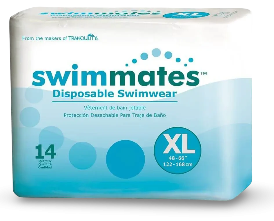 Swimmates - Product Code: 2847 Packet 14 pieces Carton Qty: 4 packs / 56 pieces Size: Small 56cm - 91cm (22 pieces) Medium 86cm - 122cm (20 pieces) Large 112cm - 137cm (18 pieces) X-Large 122cm -168cm (14 pieces) XX-Large 157cm -203cm (12 pieces) Product Enquiry Product Enquiry Account Application Account Application SPQ Limited is the sole appointed New Zealand & Australian distributor of Swimmates™ products. For all retail and wholesale enquiries please contact the SPQ team on customerservice@spq.co.nz or phone +64 6 879 6328 Swimmates® Disposable Adult & Youth Swim Diapers are designed to be worn under a bathing suit to provide containment for bowel incontinence. Ideal for aqua therapy or any day in the pool. Providing dignity, confidence and discretion. Feel confident and secure, enjoy the water and experience the advantages of buoyant exercise without the worry of embarrassment. Designed to have minimal swelling and does not break apart. Blue moisture-proof barrier and Kufguards® (inner leg cuffs) help contain bowel incontinence, keeping the pool and bathing suit clean. Wide range of sizes to fit most youth, teen and adult swimmers. Latex-free. Packet quantity: 14 pieces Carton quantity: 4 packs / 56 pieces Key Features Highly Comfortable Form-Fitting & Discreet to make it easier to hide under swim suit. Easy to Remove with tear away side seam Blue rear waist elastic on an ample, full rise waist panel for a better fit that is easy to pull up and down Designed to discreetly secure bowel incontinence Instructions ** Swimmates discreet disposable bowel containment swimwear is designed for one time use under swimwear then easily torn away and disposed of after swimming ** Pull up like regular underwear, the back/rear of the product has distinctive blue elastic on the waistline. To remove, use the tear away side seams for easy removal. Roll the brief and dispose responsibly.